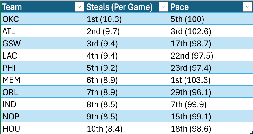 While steals and pace aren’t directly correlated, the personnel and identity of a team generating those steals can often align with an up-tempo style of play. The table below will show the top ten teams in steals per game and where they rank in pace.