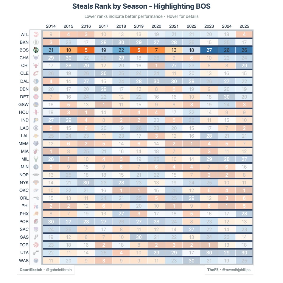 The Celtics were 28th in transition frequency per game last season and generating steals has never been a strength under Mazzulla.