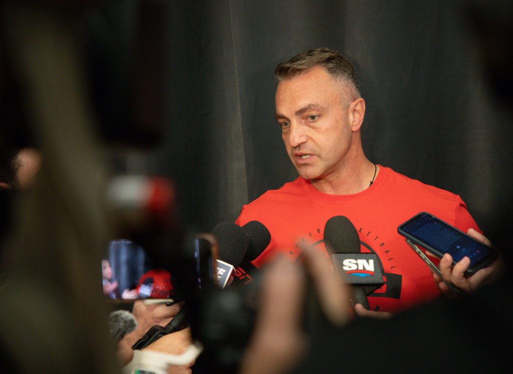 Toronto Raptors head coach Darko Rajakovic talks with media after the second day of training camp inside the Jack Simpson Gymnasium in the University of Calgary on Wednesday, Oct. 1, 2025. (Alejandro Melgar)