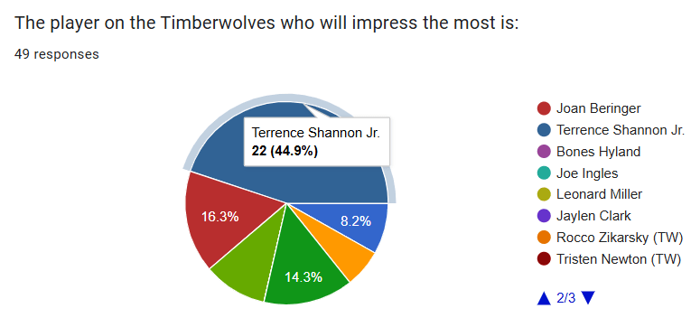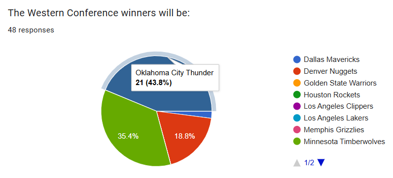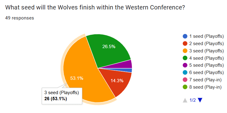 Over 95% of voters believe that the Wolves will finish the season as a top four seed in the Western Conference. Having home court advantage will be crucial in the uber competitive West, so seeding will matter. The three seed seems realistic considering their competition will likely be the reigning champion Oklahoma City Thunder and the reloaded Denver Nuggets.