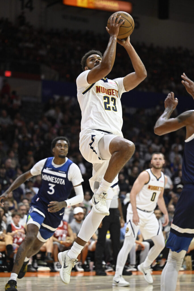 Oct 4, 2025; San Diego, California, USA; Denver Nuggets forward Cameron Johnson (23) shoots over Minnesota Timberwolves guard Rob Dillingham (4) during the first half at Pechanga Arena. Mandatory Credit: Denis Poroy-Imagn Images