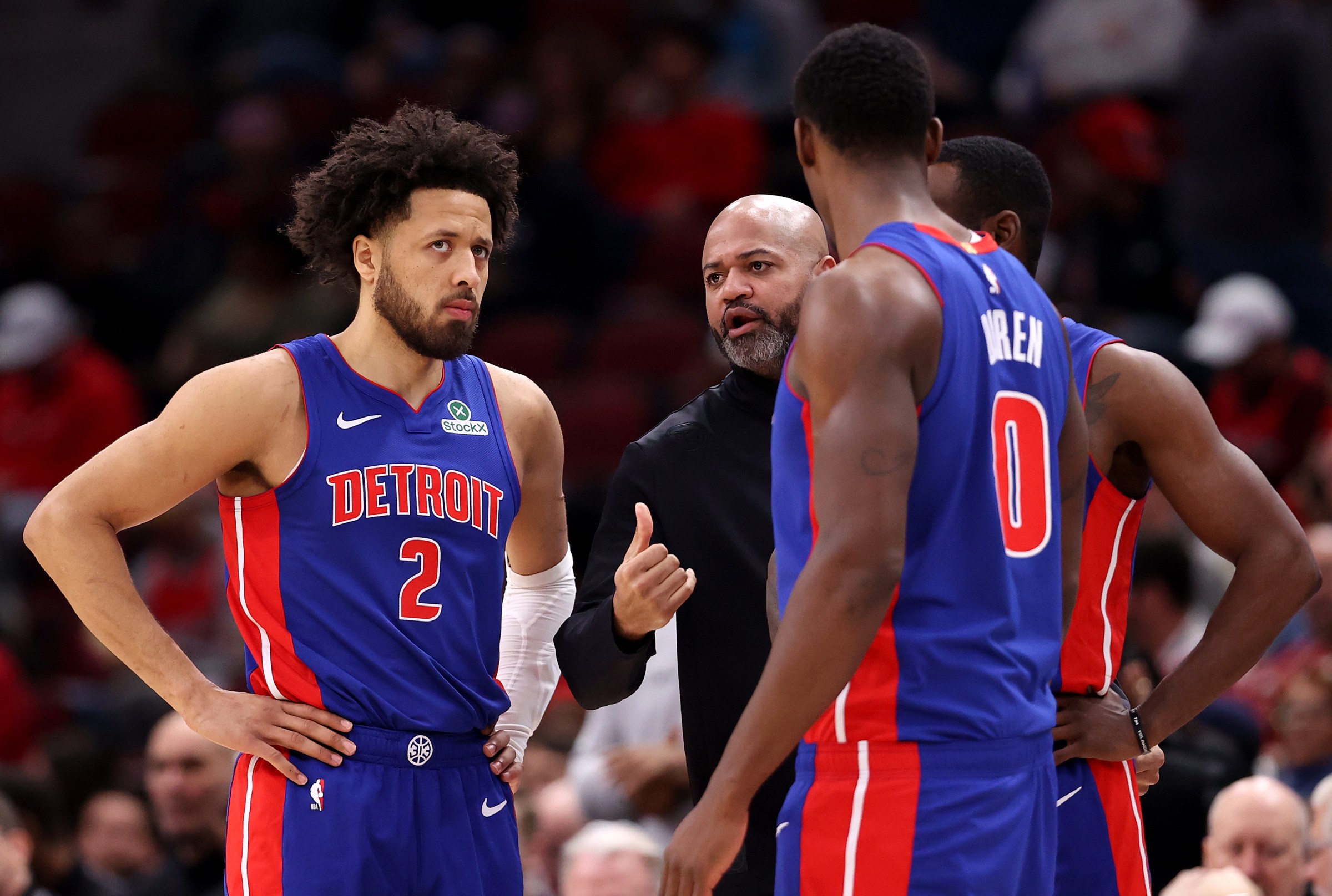 CHICAGO, ILLINOIS – FEBRUARY 12: Cade Cunningham #2 and Jalen Duren #0 speak with ead coach J. B. Bickerstaff of the Detroit Pistons against the Chicago Bulls at the United Center on February 12, 2025 in Chicago, Illinois. NOTE TO USER: User expressly acknowledges and agrees that, by downloading and or using this photograph, user is consenting to the terms and conditions of the Getty Images License Agreement. (Photo by Luke Hales/Getty Images) Getty Images