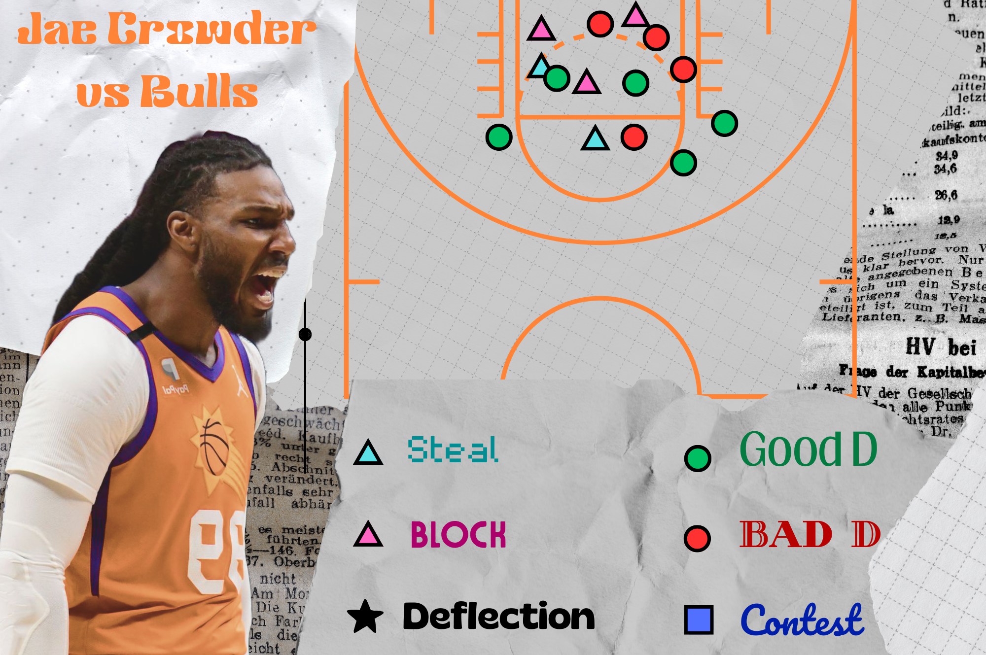 While waiting for the start of the season, here’s a little retrospective and analysis of Jae Crowder’s defensive performance (clip by clip) against the Bulls — a player in the shadows who was largely responsible for the Suns’ collective success that season. Let’s see, even in a regular season game, if he was important.