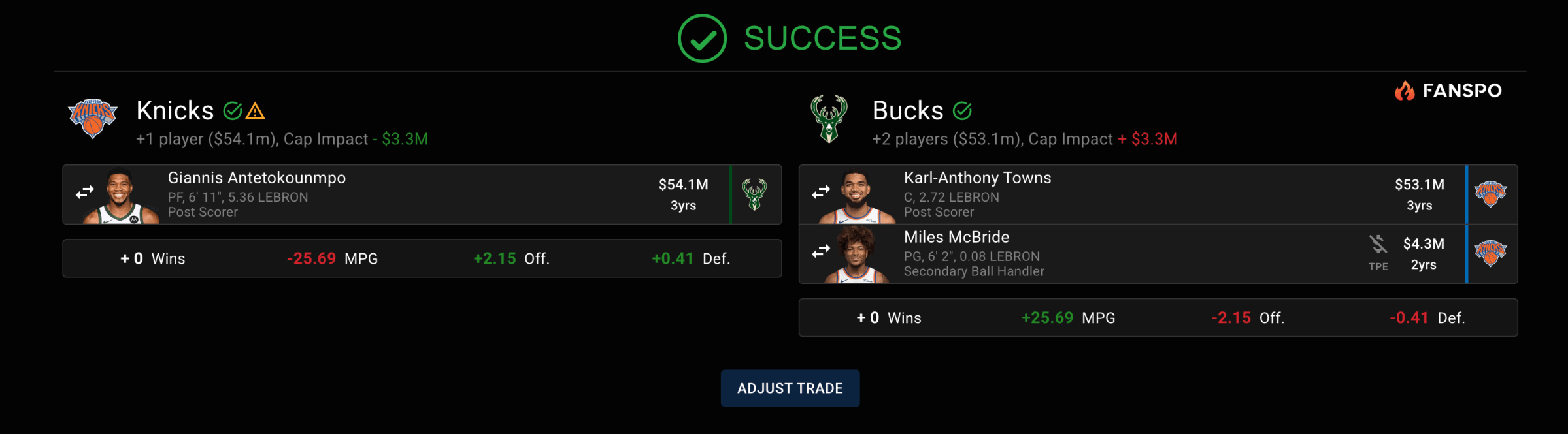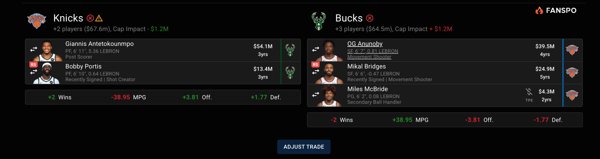 So, the Knicks would lose a bidding war; we know this. The wild card is Giannis threatening his contract situation. If he says that he will not re-sign with any of the prospective teams except the Knicks, that opens a pathway. Do I find this likely? Probably not. He’s never been the type to be that confrontational, and the threat rings hollow when the Knicks will not be able to sign him in free agency in 2027 due to a lack of cap space.