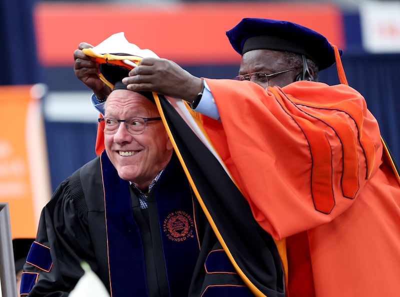 2024 Syracuse University Commencement Former Syracuse basketball coach Jim Boeheim receives an honorary degree during the 2024 Syracuse University Commencement Ceremony held at the JMA Wireless Dome May 12, 2024. Dennis Nett | dnett@syracuse.com (Dennis Nett/dennis nett | dnett@syracuse.com)