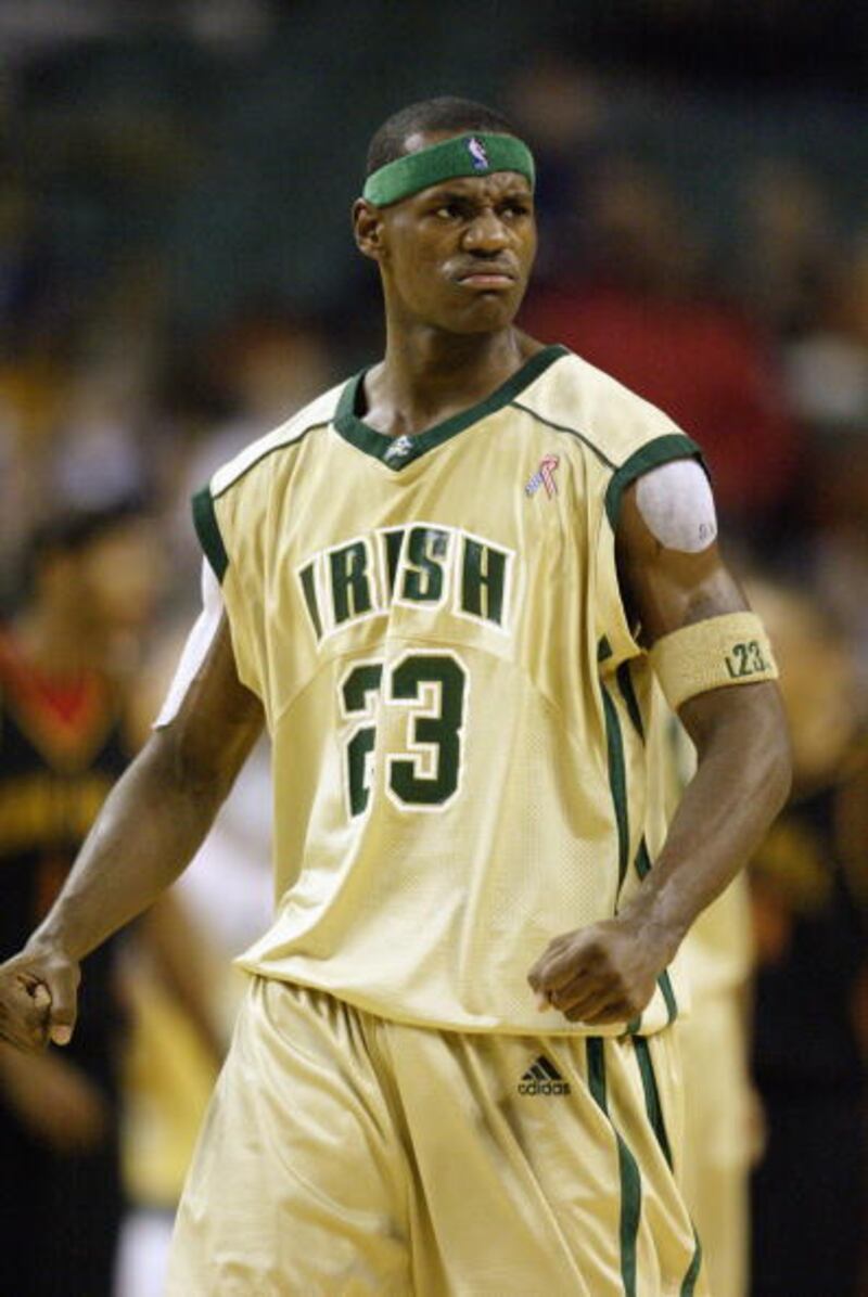 Photos: LeBron James through the years 2002: LeBron James of St. Vincent-St. Mary High School clenches his fists after making a shot against Oak Hill Academy at the Cleveland State University Convocation Center on December 12, 2002, in Cleveland, Ohio. (Tom Pidgeon/Getty Images)