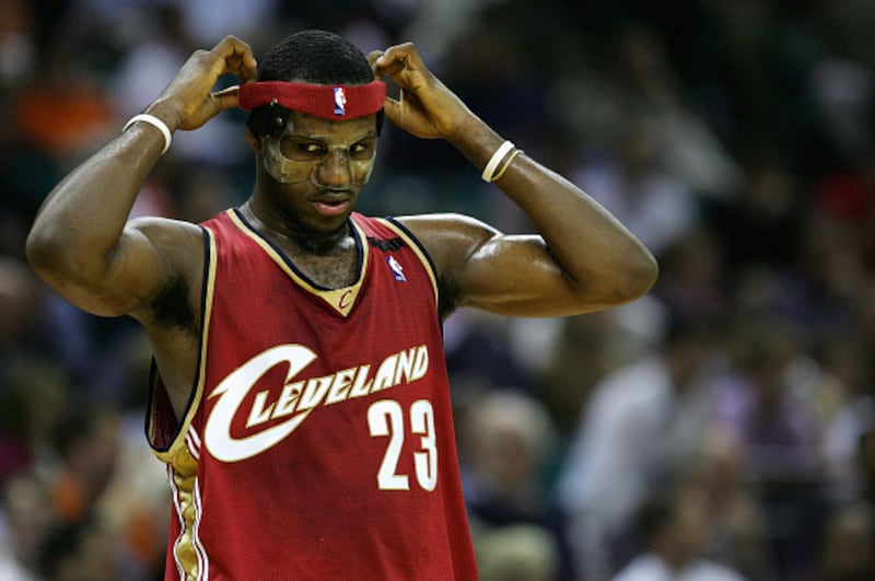 Photos: LeBron James through the years 2005: LeBron James of the Cleveland Cavaliers puts on a protective mask in his first game back since an injury to the face during their game against the Charlotte Bobcats on January 3, 2005, at the Charlotte Coliseum in Charlotte, North Carolina. (Streeter Lecka/Getty Images)