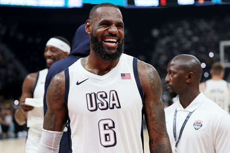 Photos: LeBron James through the years 2024: LeBron James #6 of the United States reacts during an exhibition game between the United States and Serbia ahead of the Paris Olympic Games at Etihad Arena on July 17, 2024 in Abu Dhabi, United Arab Emirates. (Photo by Christopher Pike/Getty Images) (Christopher Pike/Getty Images)