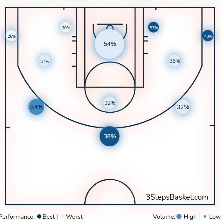 Here is a shot chart of Jalen Green’s last year with the Houston Rockets, courtesy of 3stepsbasket. Highlighted is his shooting percentage in each area, and the size of the circle dictates the preference of the shot. As you can see, not only does he have his highest percentage at 54% at the rim, but also that the circle is the largest of them all, signaling it is his most common shot. With the right block also being 52% this shows that if Green can work in some off-ball movement and cutting from the right side, he is more likely to hit a shot there. Another interesting key is that Green is the most successful from the right corner at 43%, indicating that he clearly has more success on one side of the court. The Suns should utilize him on the right wing to create more offense.
