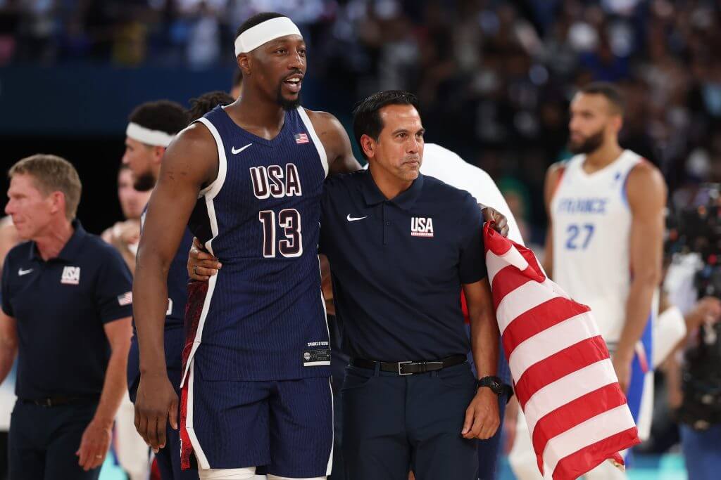 Heat center Bam Adebayo made sure to give his coach Erik Spoelstra his due after Spoelstra was appointed to head coach of Team USA. (Michael Reaves / Getty Images)