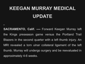 Either way, a challenging start to the season just got a whole lot more difficult for Sacramento as they play the first 20-plus games without Keegan Murray.
