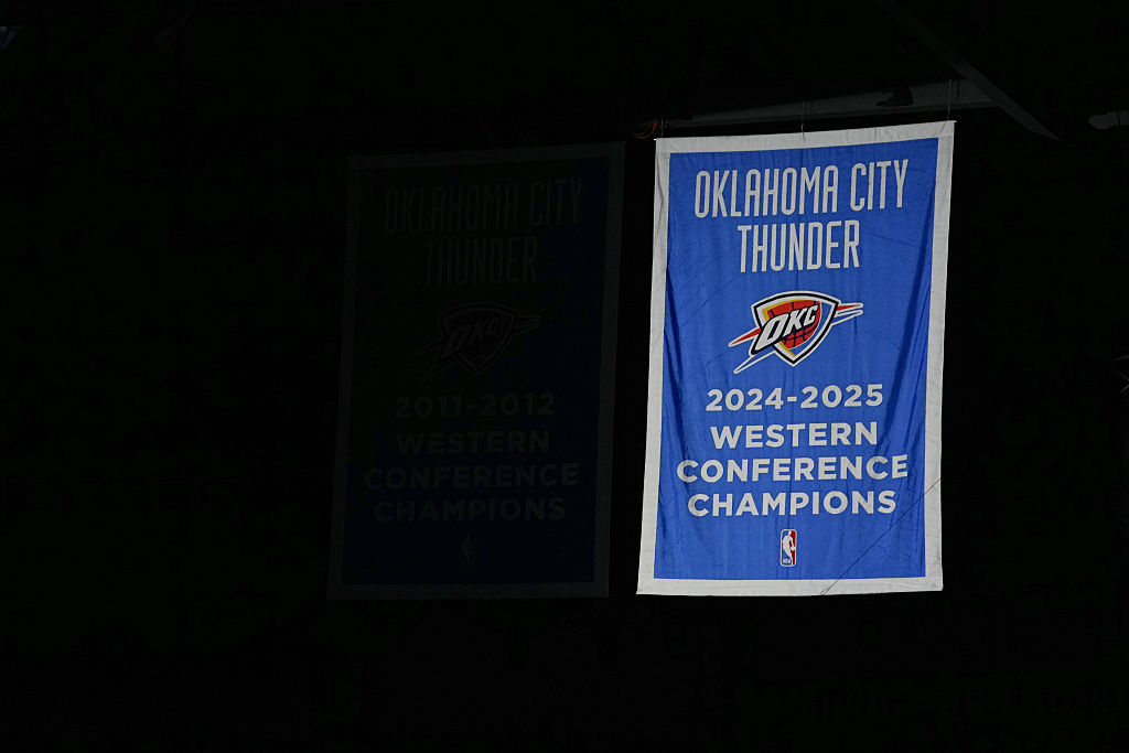 Oklahoma City Thunder Western Conference Champions banner before the Indiana Pacers against the Oklahoma City Thunder game during Game One of the 2025 NBA Finals on June 5, 2025 at Paycom Center in Oklahoma City, Oklahoma. Photo by Morgan Givens/NBAE via Getty Images)Pacific DivisionGolden State WarriorsLos Angeles ClippersLos Angeles LakersPhoenix SunsSacramento Kings