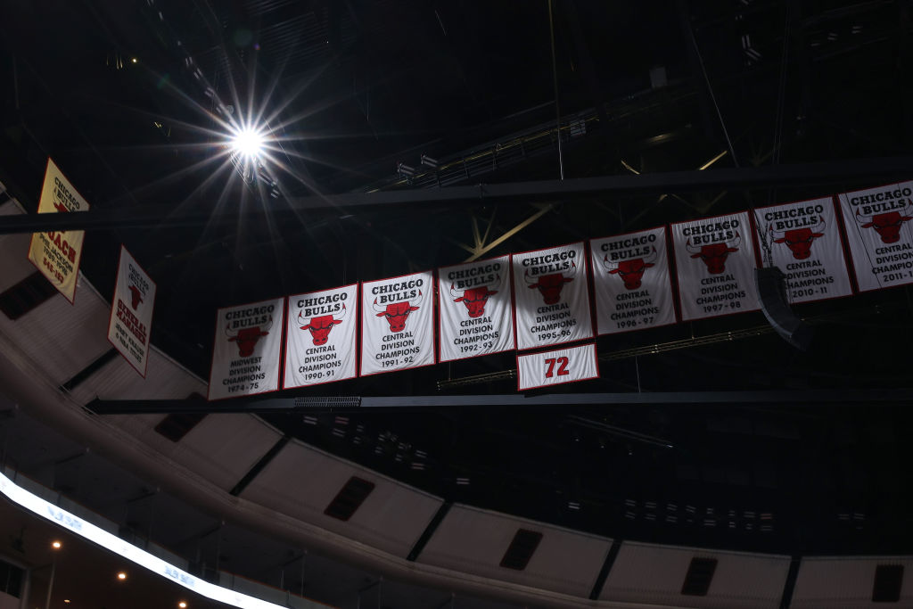 Chicago Bulls Championship banners during the Emirates NBA Cup game on November 22, 2024 at United Center in Chicago, Illinois. Photo by Jeff Haynes/NBAE via Getty Images.Southeast DivisionAtlanta HawksCharlotte HornetsMiami HeatOrlando MagicWashington Wizards