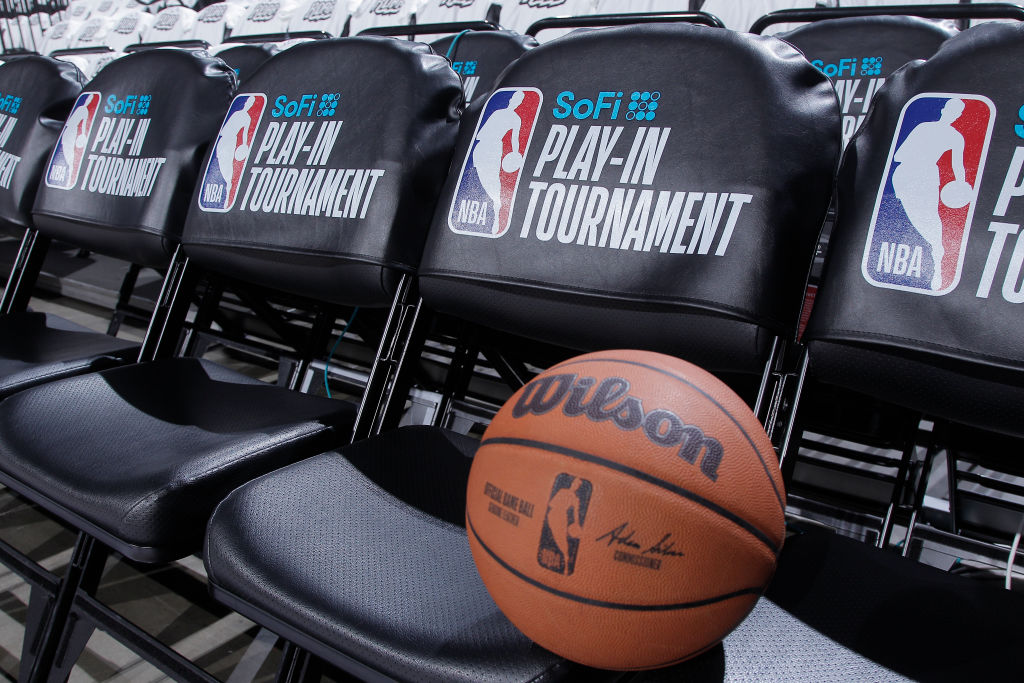 Wilson basketball with SoFi Play-In Tournament signage prior to the game between the Golden State Warriors and Sacramento Kings during the 2024 Play-In Tournament on April 16, 2024 at Golden 1 Center in Sacramento, California. Photo by Rocky Widner/NBAE via Getty Images.Play-In Format:Game 1: 7th seed hosts 8th seed, the winner becomes the 7th seed.Game 2: 9th seed hosts 10th seed, the loser is eliminated.Game 3: Loser of Game 1 vs. Winner of Game 2, the winner becomes the 8th seed.