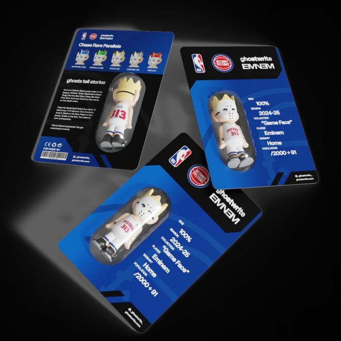 When it comes to NBA teams engaging with their local hip-hop community, no one is doing it like the Detroit Pistons. The team’s latest collaboration with a hometown hero is currently available. The “Game Face” blind bag collectible features a figurine of Eminem decked out in a Pistons jersey bearing the Motor City’s infamous 313 area code and an anatopistic hockey mask. There are two versions: one, for general sale, is the $45 2.75” figure in a white home jersey. There were 2,000 produced, and they come with a limited-edition T-shirt, shipping out on December 5.