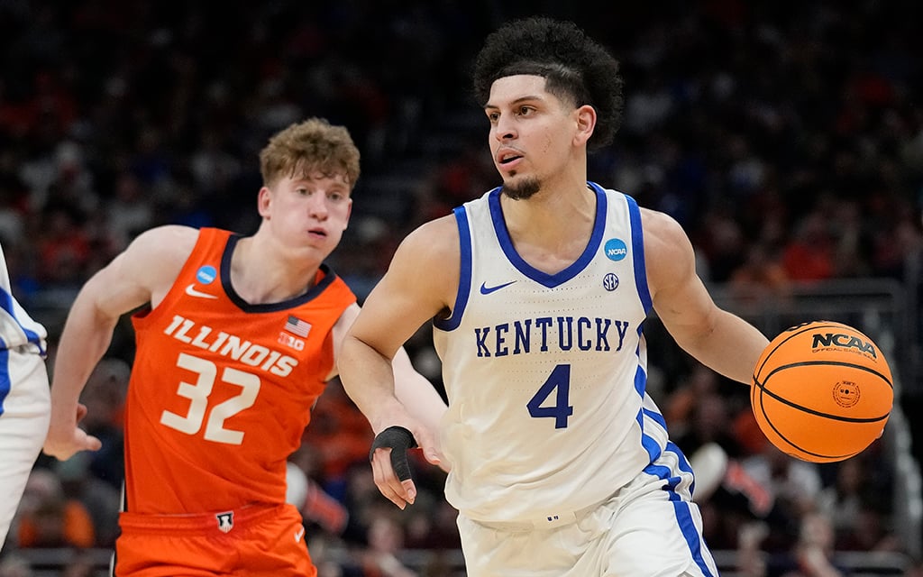 Phoenix Suns pick and former Kentucky guard Koby Brea, right, dribbles the ball past Illinoi’ Kasparas Jakucionis during a game in the NCAA Men’s Basketball Tournament in Milwaukee. (Photo by Patrick McDermott/Getty Images)