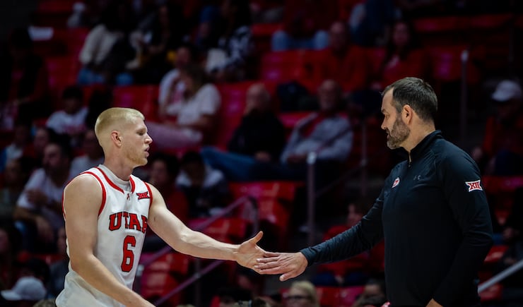 Utah Utes head coach Alex Jensen high-fives Utah Utes guard Jacob Patrick (6) during an NCAA men’s basketball exhibition game at the Jon M. Huntsman Center in Salt Lake City on Friday, Oct. 17, 2025. | Tess Crowley, Deseret News