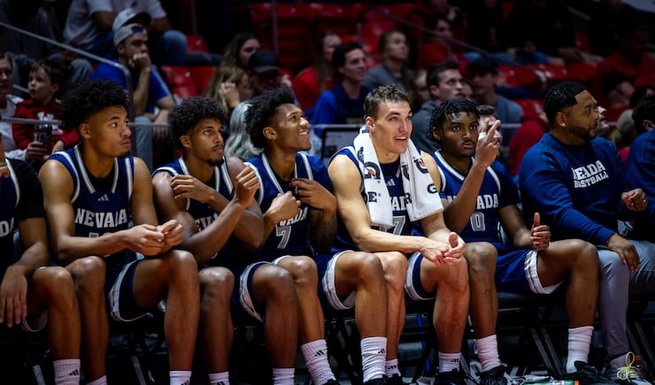 Nevada Wolf Pack players smile on the bench during an NCAA men’s basketball exhibition game against the Utah Utes at the Jon M. Huntsman Center in Salt Lake City on Friday, Oct. 17, 2025. | Tess Crowley, Deseret News