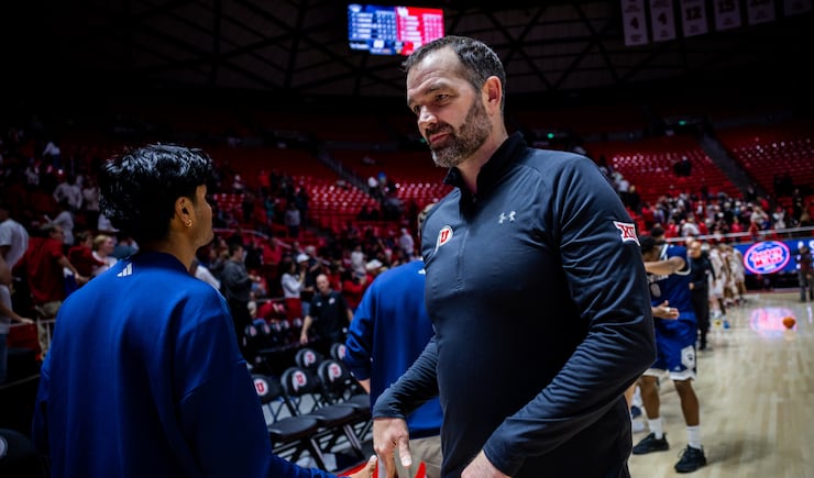 Utah Utes head coach Alex Jensen high-fives Nevada Wolf Pack players and staff after the Utah Utes lost 80-77 to the Nevada Wolf Pack during an NCAA men’s basketball exhibition game at the Jon M. Huntsman Center in Salt Lake City on Friday, Oct. 17, 2025. | Tess Crowley, Deseret News