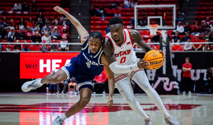 Utah Utes forward James Okonkwo (32) takes the ball down the court with Nevada Wolf Pack guard Tayshawn Comer (12) on defense during an NCAA men’s basketball exhibition game at the Jon M. Huntsman Center in Salt Lake City on Friday, Oct. 17, 2025. | Tess Crowley, Deseret News