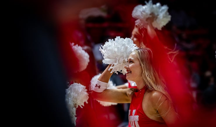The Utah Utes cheerleaders cheer during an NCAA men’s basketball exhibition game against the Nevada Wolf Pack at the Jon M. Huntsman Center in Salt Lake City on Friday, Oct. 17, 2025. | Tess Crowley, Deseret News