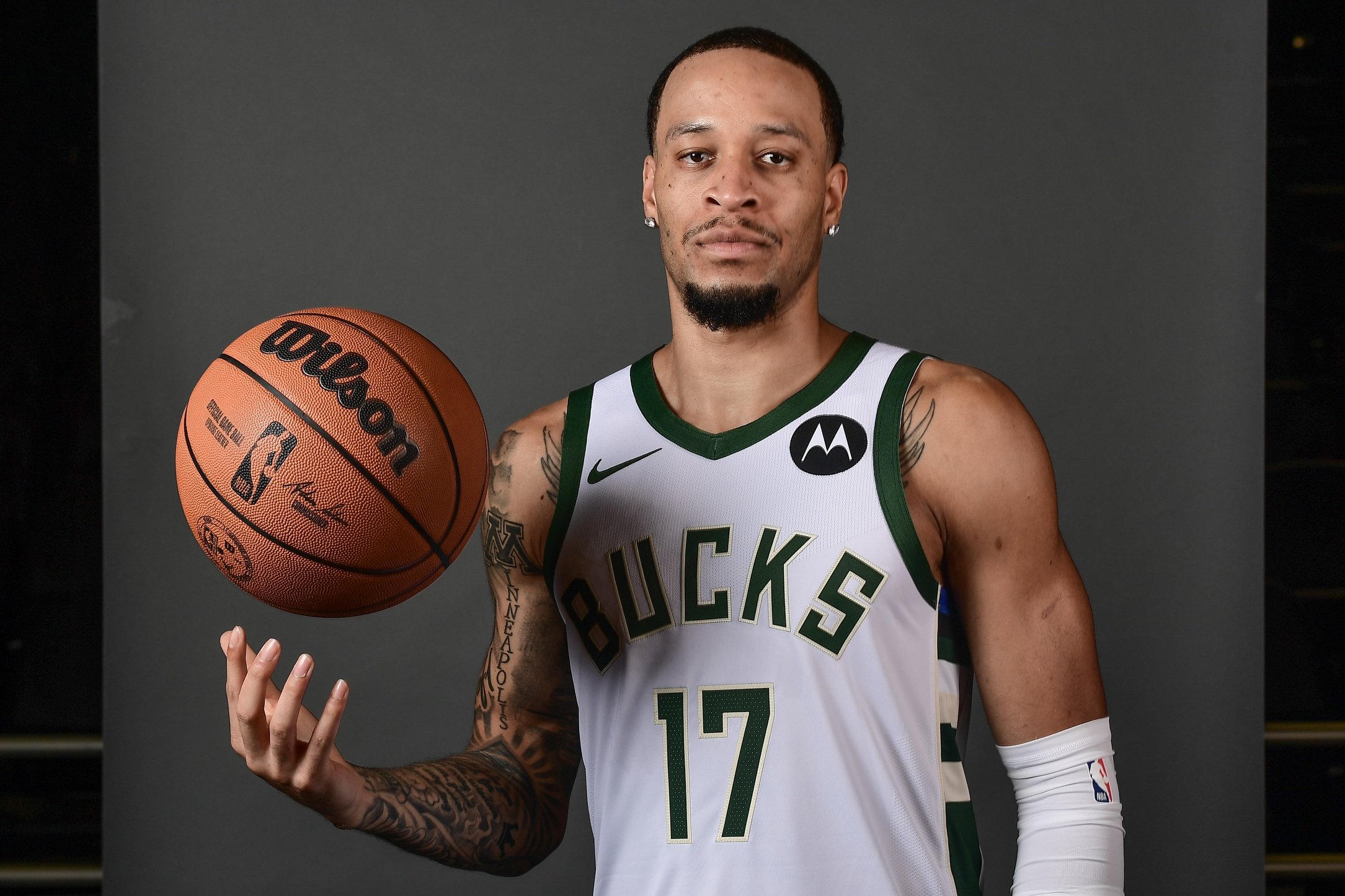 Sep 29, 2025; Milwaukee, WI, USA; Milwaukee Bucks forward Amir Coffey (17) poses for a picture during Milwaukee Bucks Media Day at the Fiserv Forum. Mandatory Credit: Benny Sieu-Imagn Images