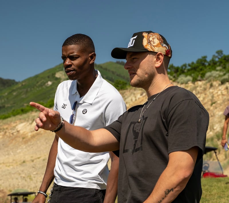 Coinlete founders Xavier Jackson and Brett Horrocks pose at the grand opening of the Centerville Tee Box location. Coinlete was involved in connecting Tee Box with former Jazz athlete Jordan Clarkson, who became an ambassador for the company. | Photo by Sean Zahm