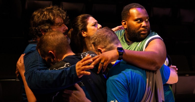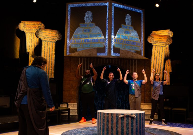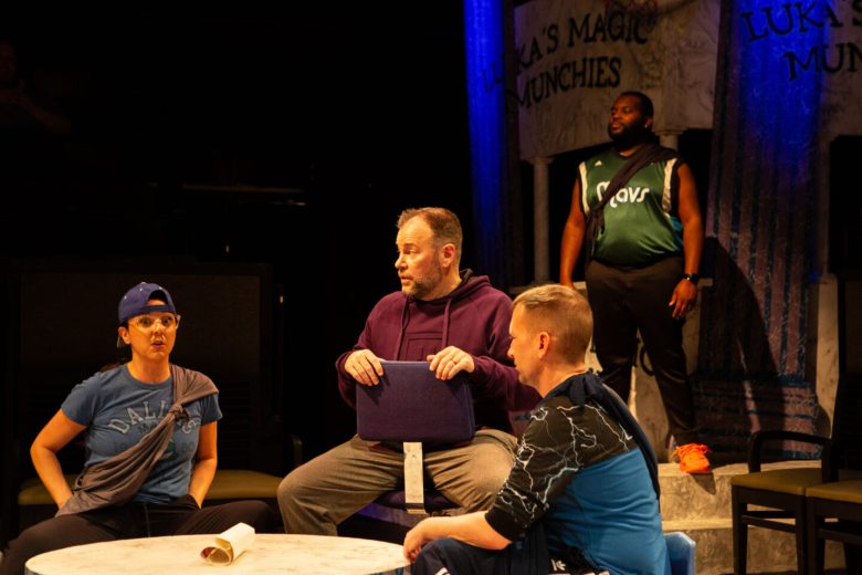 Presented as a Greek tragedy with a chorus of four led by Brian Gonzalez, whose versatility anchored the show, the actors juggled roles that introduced Kidd, Mark Cuban, arena vendors and Doncic himself to the audience. Davian Jackson, Jeff Swearingen and Elizabeth Evans effortlessly transitioned into their assigned characters with Red Bull energy over the 90-ish minute show. Among chorus member Chad Cline’s roles was the star player himself. With a heavy Eastern European accent and youthful buoyancy, Cline channeled a loveable Dončić-ish characterization.