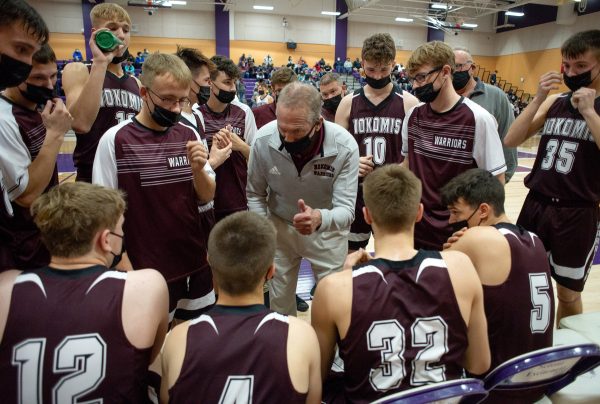 Nokomis head coach Earl Anderson talks with his team during halftime at a preseason game against Hampden Academy on Dec. 2, 2021. Credit: Linda Coan O’Kresik