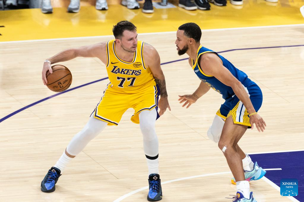 Los Angeles Lakers’ Luka Doncic (L) is defended by Golden State Warriors’ Stephen Curry during the 2025-2026 NBA regular season match between Los Angeles Lakers and Golden State Warriors in Los Angeles, the United States, Oct. 21, 2025. (Photo by Ringo Chiu/Xinhua)