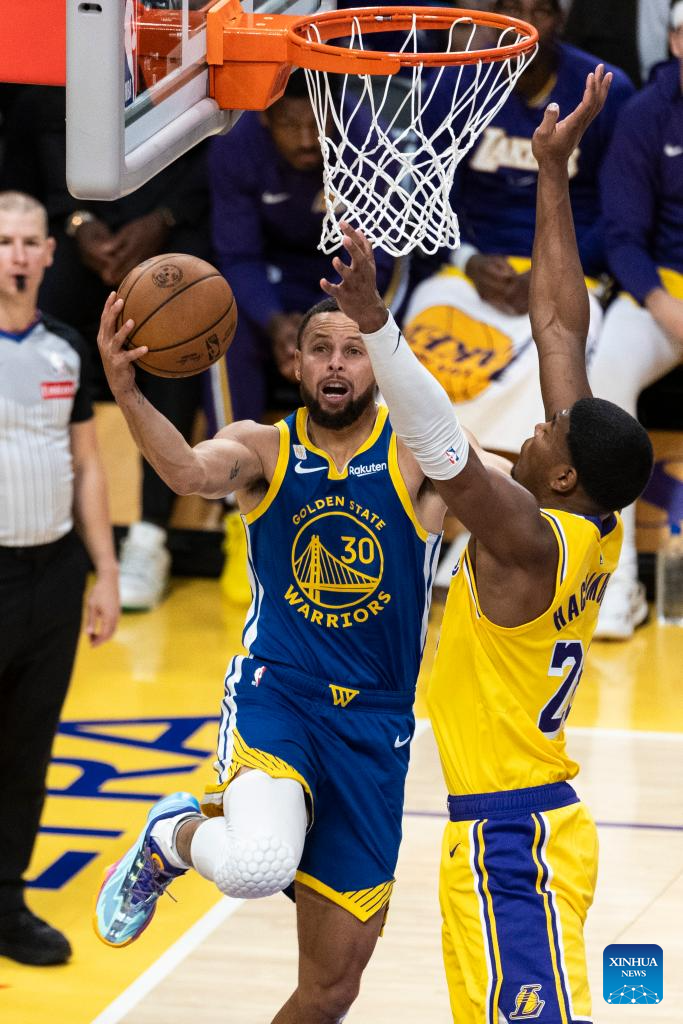 Golden State Warriors’ Stephen Curry (L) goes to the basket during the 2025-2026 NBA regular season match between Los Angeles Lakers and Golden State Warriors in Los Angeles, the United States, Oct. 21, 2025. (Photo by Ringo Chiu/Xinhua)
