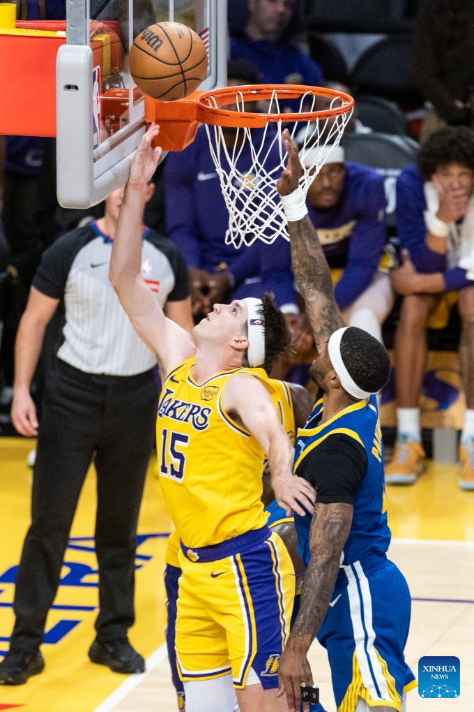 Los Angeles Lakers’ Austin Reaves (L) goes to the basket during the 2025-2026 NBA regular season match between Los Angeles Lakers and Golden State Warriors in Los Angeles, the United States, Oct. 21, 2025. (Photo by Ringo Chiu/Xinhua)