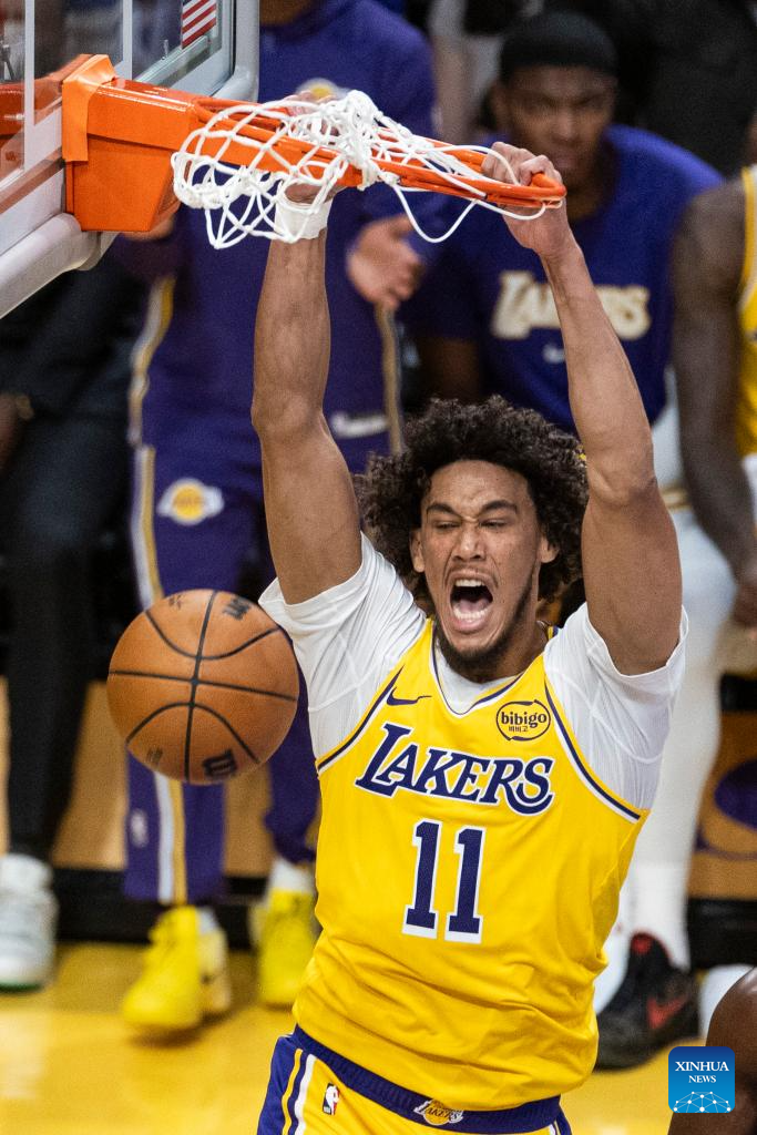 Los Angeles Lakers’ Jaxson Hayes dunks during the 2025-2026 NBA regular season match between Los Angeles Lakers and Golden State Warriors in Los Angeles, the United States, Oct. 21, 2025. (Photo by Ringo Chiu/Xinhua)