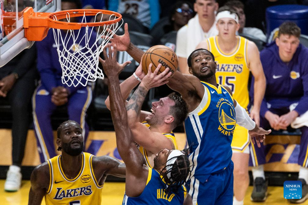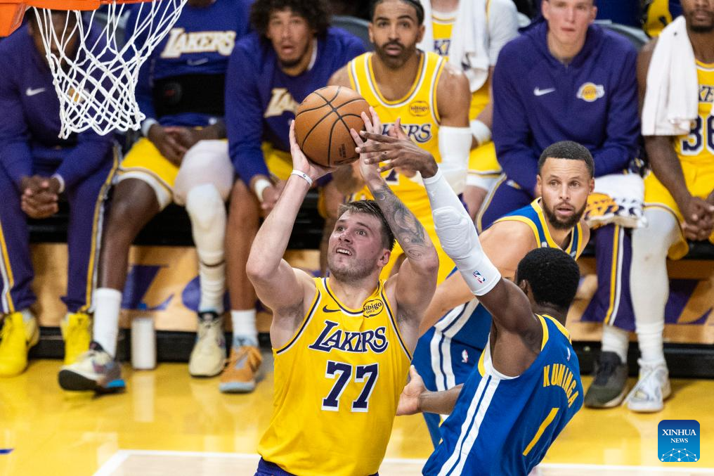 Los Angeles Lakers’ Luka Doncic (C) goes to the basket under the defence of Golden State Warriors’ Buddy Hield (front) and Jonathan Kuminga (R) during the 2025-2026 NBA regular season match between Los Angeles Lakers and Golden State Warriors in Los Angeles, the United States, Oct. 21, 2025. (Photo by Ringo Chiu/Xinhua)
