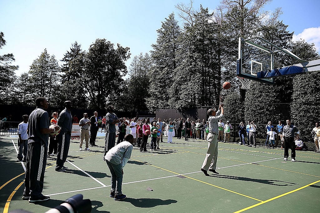 In 2009, America’s first Black president added basketball lines and baskets to the tennis courts. In 2011, President Obama notably celebrated his 50th birthday with a game of basketball with NBA stars like LeBron James, Chris Paul, and Derrick Rose, as well as Magic Johnson, who came out of retirement for the presidential matchup.