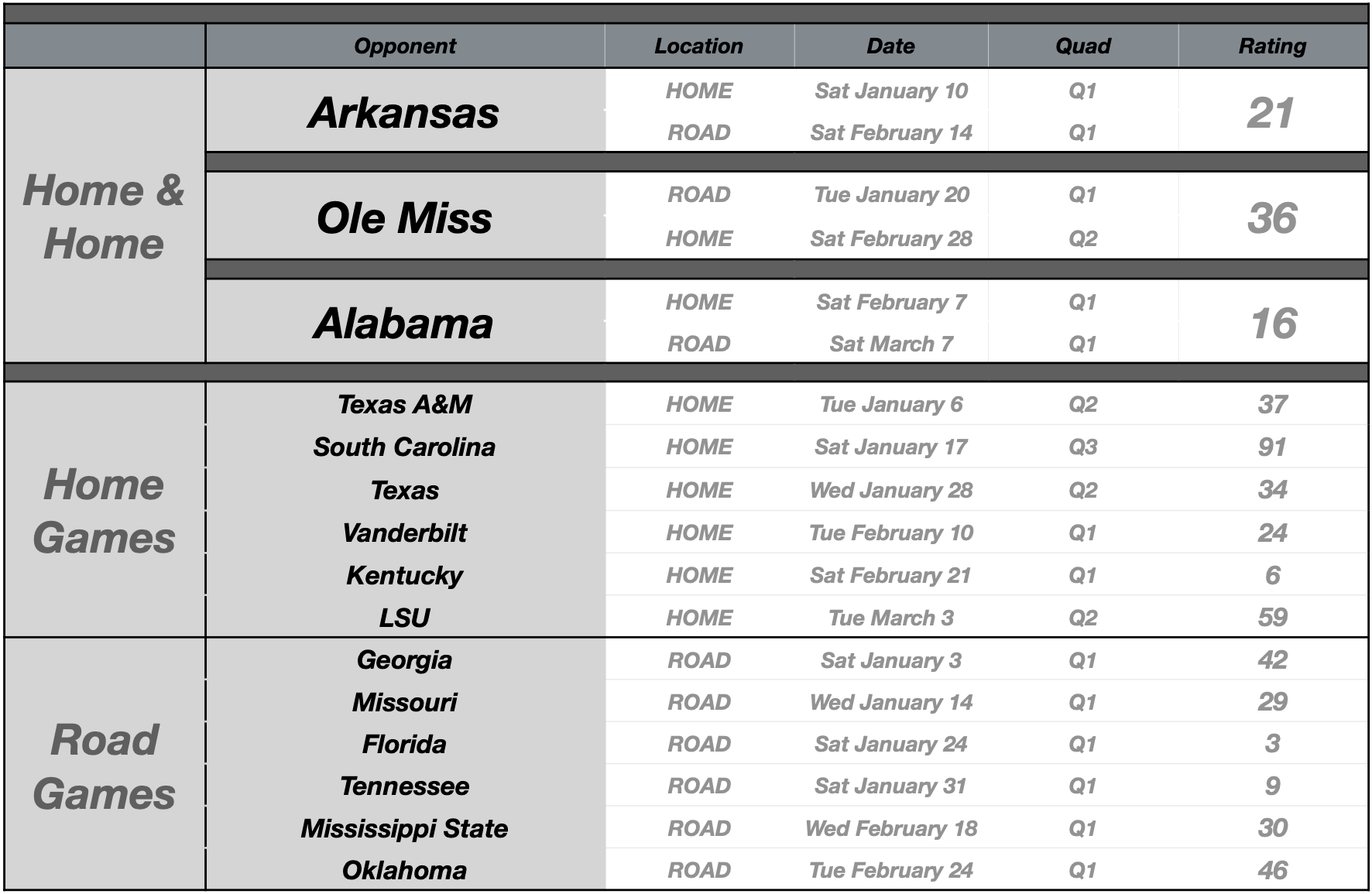 Last season: 32 – 6 (15-3 in conference) #4 overallThe Masses Prediction: 6th in conference, 10.71 – 7.29SEC Media Pick: 6thAnalytics Average: 6th in conference, 23th overall