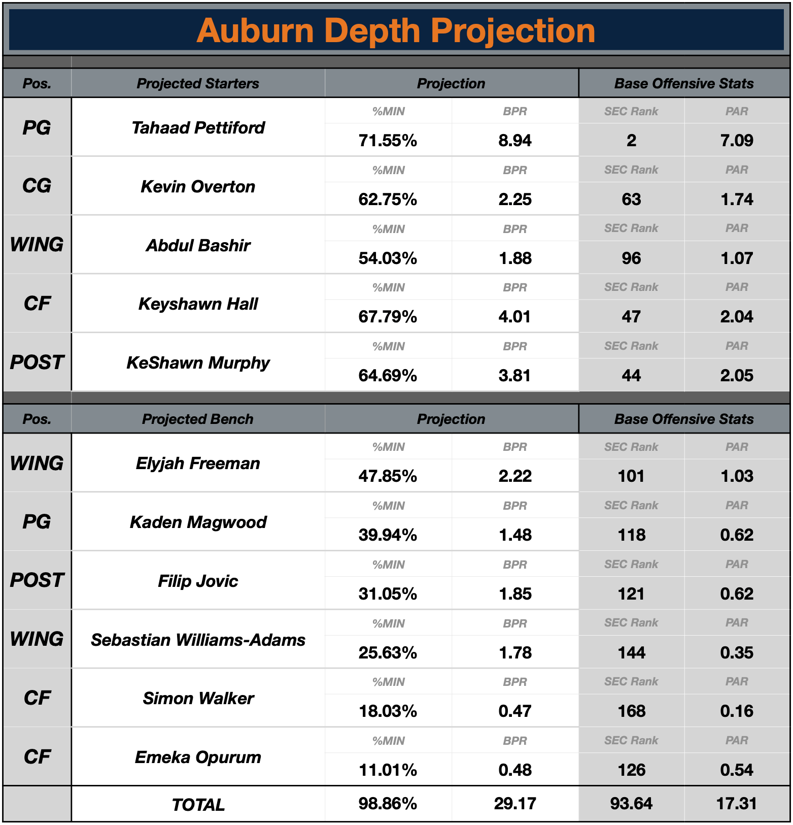 Ultimately, I decided not to change picks. And neither did any of the other voters. With or without Pearl Auburn was one of the biggest black boxes in the SEC because of how the roster was built. When you’re starting with Tahaad Pettiford, you’re already in a good place, as EvanMiya.com has Pettiford ranked 4th nationally in his proprietary BPR rankings. And he’s third in Offensive BPR, meaning Miya expects Auburns offense to pick up significantly when Pettiford is running the show. Even Rock M+‘s Matt Watkins PAR (points above replacement) ranks Pettiford 2nd in the conference behind only Labaron Philon. PAR is adjusted for time spent on the floor, so the number might even pick up if Pettiford plays more than expected.