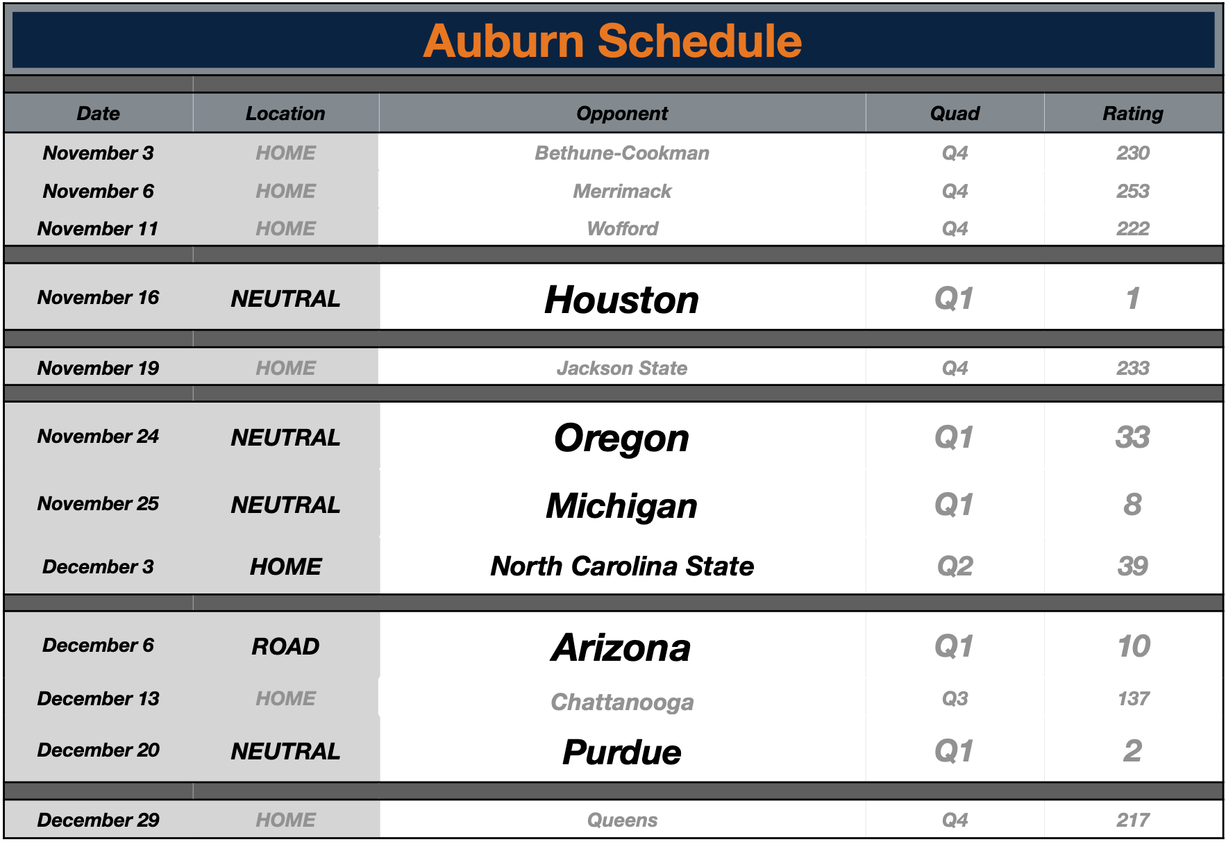 Auburn has a completely remade roster full of question marks outside of the starting point guard, and they held up to scheduling like they did last year where there was no fear. From one side it’s easy to respect the approach of scheduling some of the sports best teams. On the other hand… good luck!