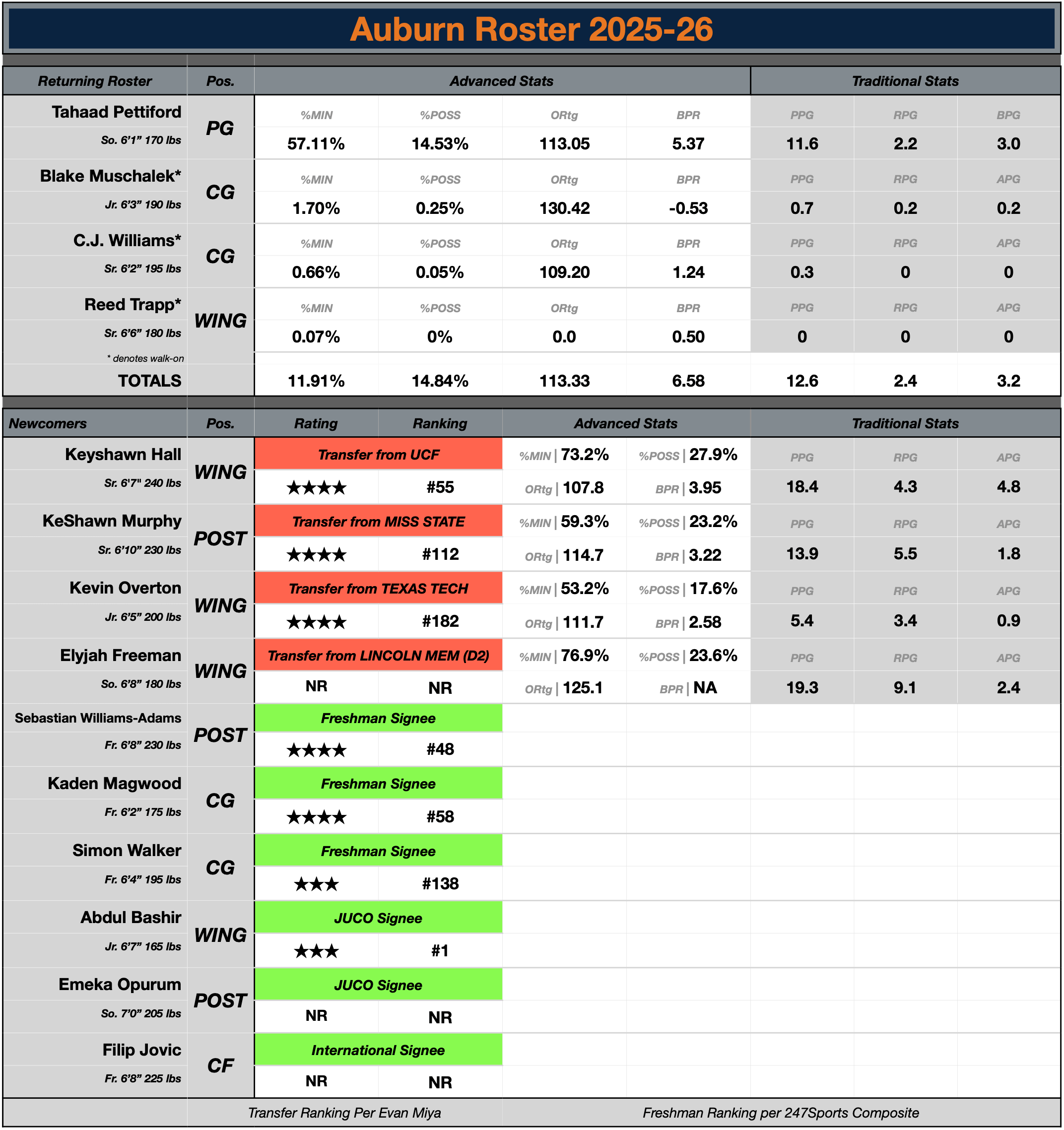 There’s no more Johni Broome or Chad Baker-Mazara. Chaney Johnson is gone, and so is Miles Kelly. Denver Jones and Dylan Cardwell have each moved on. This is going to be a whole new look Auburn team.