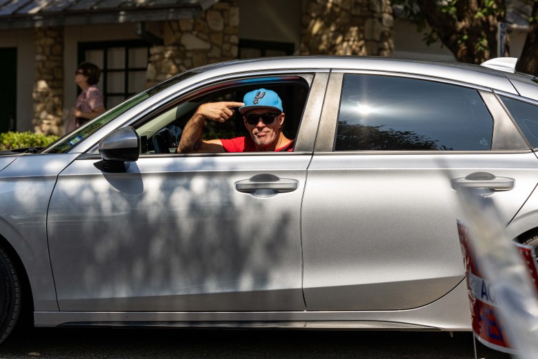 A voter shows off his Spurs hat while exiting the parking lot of the Lions Field early voting polling location on Wednesday. The voter was not seen entering or exiting the voting entrance with the cap on. Credit: Amber Esparza / San Antonio Report