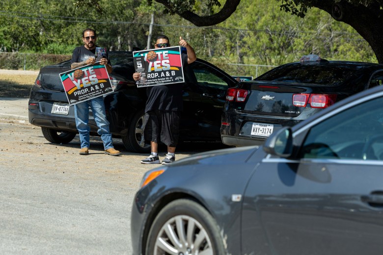 Spurs supporters Rick Regallado and Fernando Hernandez wave to and approach cars hoping to encourage people to vote for Propositions A and B as they enter the parking lot at the Lions Field early voting polling location on Wednesday. Credit: Amber Esparza / San Antonio Report