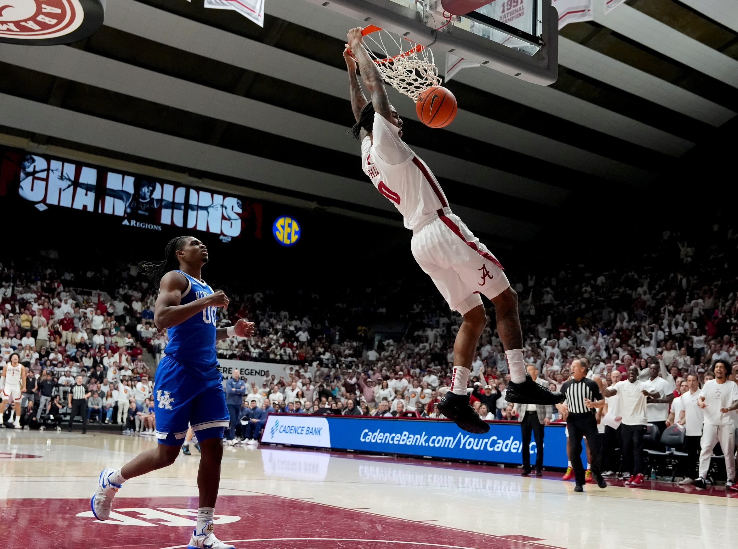 Alabama guard Labaron Philon (0) dunks the ball after making a steal from Kentucky guard Otega Oweh (0) at Coleman Coliseum on Feb 22, 2025 in Tuscaloosa, Alabama. Alabama defeated Kentucky 96-83.