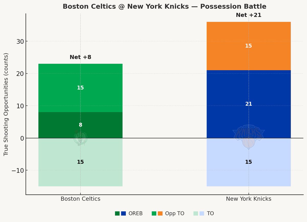 Overall, the Knicks had worse shooting efficiency than the Celtics, but because they were able to generate 21 extra possessions through offensive rebounds, they beat Boston by 10.