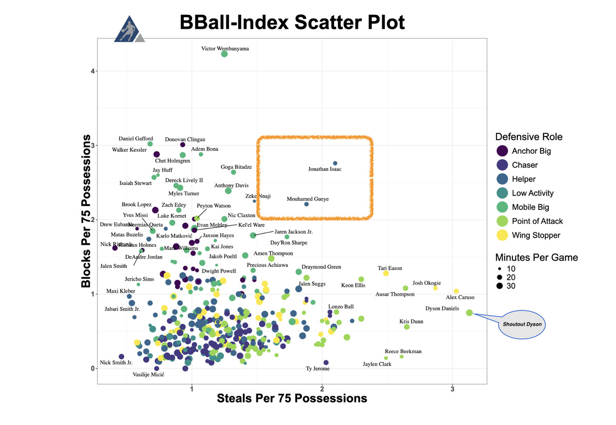 An defensive disruptor of the highest order, Gueye ranked in the 93rd percentile in defensive EPM per dunksandthrees, and was one of two players* (joining Jonathan Isaac) to average over two blocks and 1.5 steals per 75 possessions during the regular season. His defensive activity was a significant factor in the Hawks’ improved defensive rating during his minutes.