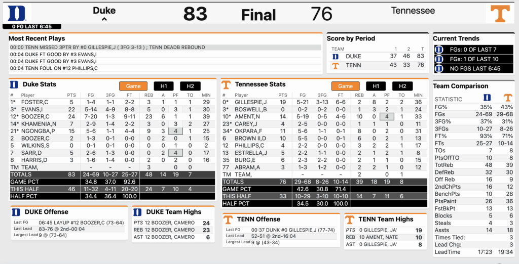 Duke went on a 10-2 run in the first 1:46 of the second half to take its first lead of the game. For comparison, it look the Blue Devils just over seven minutes to score its first 10 points of the game. The Vols could not slow down Duke early in the second half as Duke scored 23 points in the first seven minutes to race out to a 60-52 lead.