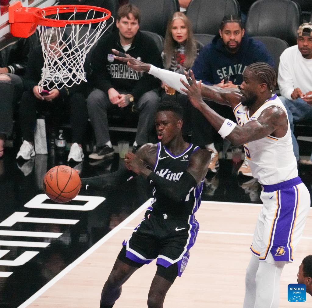 Jarred Vanderbilt (C) of Los Angeles Lakers competes during the 2025-2026 NBA regular season match between Sacramento Kings and Los Angeles Lakers in Sacramento, the United States, Oct. 26, 2025. (Photo by Sun Yuxuan/Xinhua)