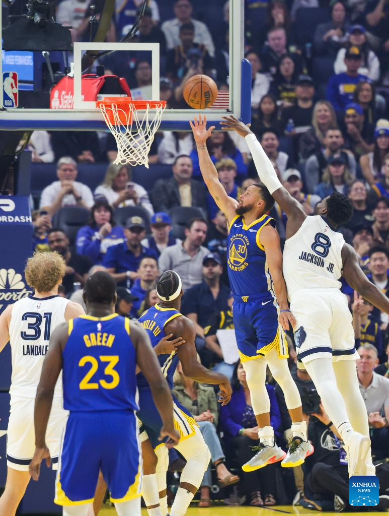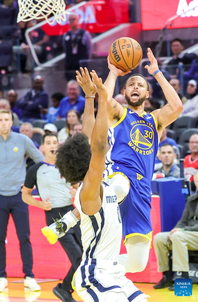 Stephen Curry (2nd R) of Golden State Warriors goes for a lay-up during the 2025-2026 NBA regular season match between Golden State Warriors and Memphis Grizzlies in San Francisco, the United States, on Oct. 27, 2025. (Photo by Arthur Dong/Xinhua)