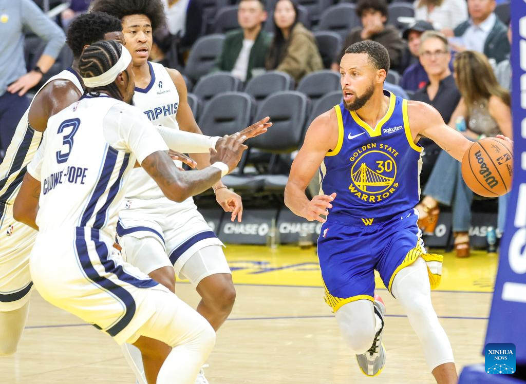 Stephen Curry (1st R) of Golden State Warriors controls the ball during the 2025-2026 NBA regular season match between Golden State Warriors and Memphis Grizzlies in San Francisco, the United States, on Oct. 27, 2025. (Photo by Arthur Dong/Xinhua)