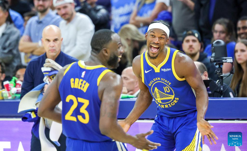 Jimmy Butler III (R) and Draymond Green of Golden State Warriors celebrate scoring during the 2025-2026 NBA regular season match between Golden State Warriors and Memphis Grizzlies in San Francisco, the United States, on Oct. 27, 2025. (Photo by Arthur Dong/Xinhua)
