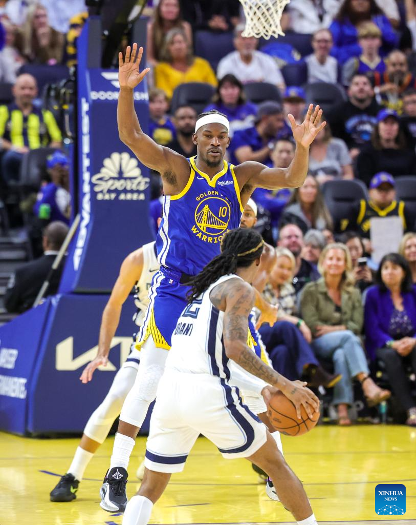 Jimmy Butler III (top) of Golden State Warriors defends during the 2025-2026 NBA regular season match between Golden State Warriors and Memphis Grizzlies in San Francisco, the United States, on Oct. 27, 2025. (Photo by Arthur Dong/Xinhua)